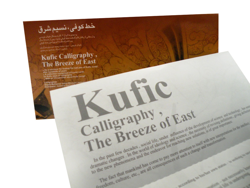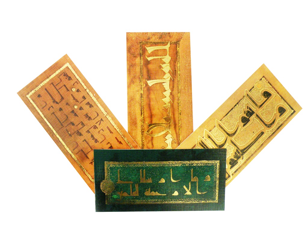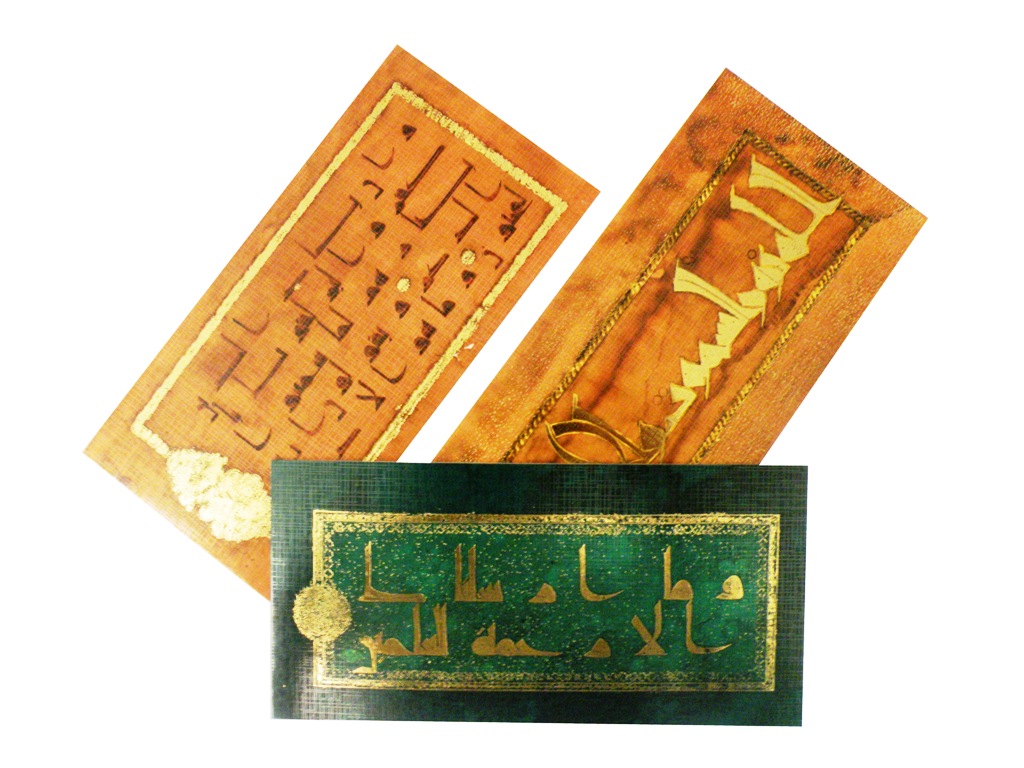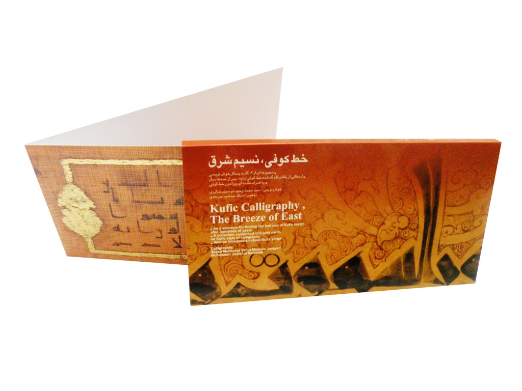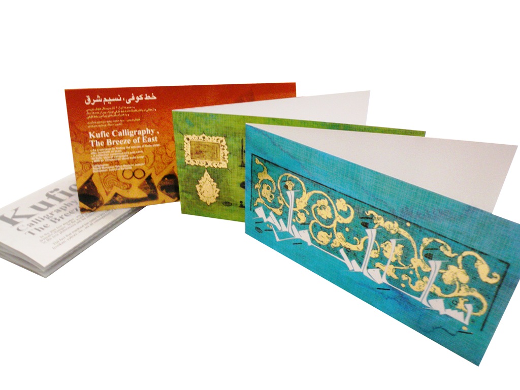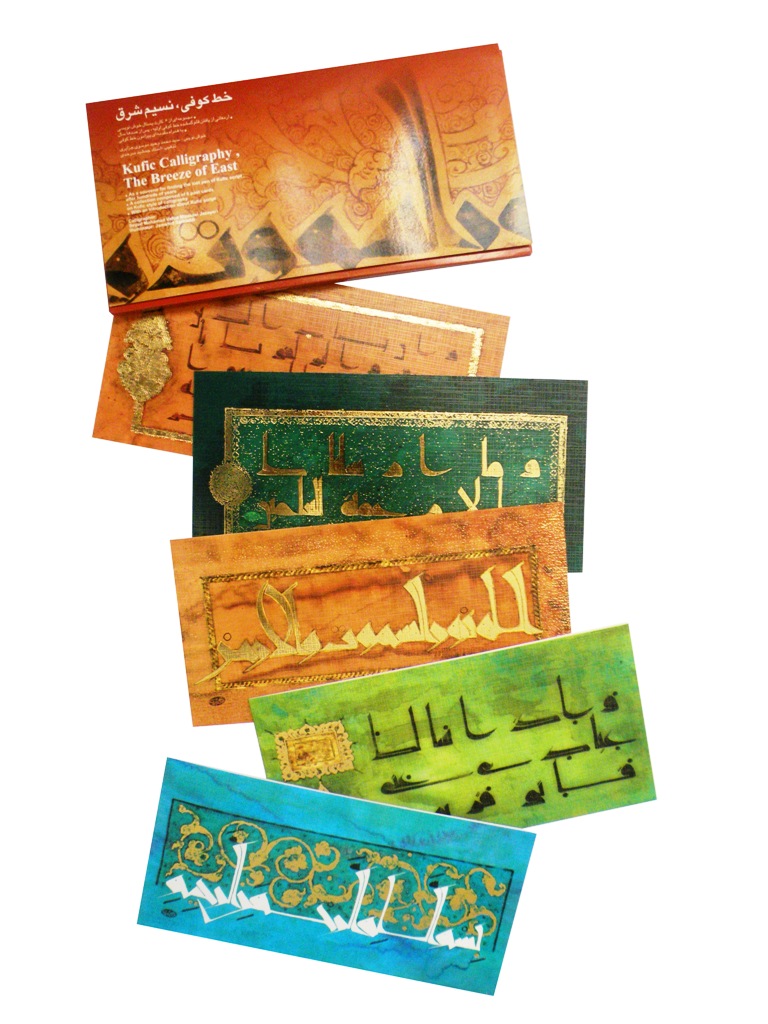 An exquisite collection of blank greetings cards bearing Qur’anic texts in the Kufic script penned by master calligrapher Seyed Mohammad Vahid Mousavi Jazayeri, on illuminated and gilded grounds by Jamshid Sarhaddi.